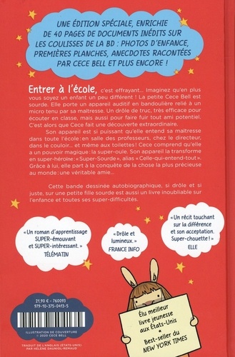 Entrer à l'école, c'est effrayant... Imaginez qu'en plus vous soyez un enfant un peu différent ! La petite Cece Bell est sourde. Elle porte un appareil auditif en bandoulière relié à un micro tenu par sa maîtresse. Un drõle de truc, très efficace pour écouter en classe, mais aussi pour faire fuir tout ami potentiel. C'est alors que Cece fait une découverte extraordinaire. Son appareil est si puissant qu'elle entend sa maîtresse dans toute l'école : en salle des professeurs, chez le directeur, dans le couloir... et même aux toilettes ! Cece comprend qu'elle a un pouvoir magique : la super-ouïe. Son appareil la transforme en super-héroine : "Super-Sourde", alias "Celle-qui-entend-tout". Grâce à lui, elle part à la conquête de la chose la plus précieuse au monde : une véritable amie... Cette bande dessinée autobiographique, si drõle et si juste, sur une petite fille sourde est aussi un livre inoubliable sur l'enfance et toutes ses super-difficultés.