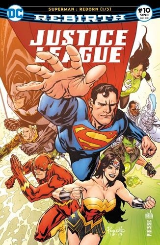 "SUPERMAN REBORN" , PREMIERE PARTIE (SUR 3) Luttant à différentes époques, les membres de la Ligue de Justice affrontent Tempus, par Bryan HITCH et Fernando PASARIN. Accompagné de son épouse Lois et de son fils Jon, Superman affronte le mystérieux Clark Kent, mais la vérité risque de détruire sa famille, par Peter J. TOMASI et Patrick GLEASON. Désireux d'aider Kid Flash à retrouver son véritable père, Barry Allen alias Flash se lance dans une course à l'autre bout du monde, qui le conduit à retrouver l'un de ses redoutables ennemis, le Captain Boomerang, par Joshua WILLIAMSON, Jesús MERINO, Neil GOOGE et Carmine DI GIANDOMENICO. Au sein du Corps des Green Lantern, John Stewart décide d'associer ses troupes à celles du Corps de Sinestro, dirigé par Soranik Natu. Mais l'alliance tourne mal quand Guy Gardner rencontre Arkillo, par Robert VENDITTI, Refael SANDOVAL et Ethan VAN SCIVER.