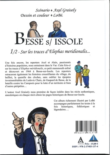 Une fois encore, les reporters Axel et Alain, passionnés d'histoires populaires, nous entrainent dans le Var. Cette fois-ci sur les traces d'Elephas méridionalis, ce petit mammouth enlisé et découvert en 1964 à Besse-sur-Issole. Les reporters retraceront également les histoires croustillantes du village, du beffroi, la querelle des cloches, sans oublier les épopées invraisemblables de Ludovic Chaix, de Gaspard de Besse, de la bataille contre les Campsois pour la lutte d'un territoire et bien d'autres péripéties... L'auteur Axel Graisely nous promène de façon inédite dans les récits authentiques, anecdotiques où chaque récit côtoie les pages historiques de Besse-sur-Insole. Cet album richement illustré par LoBé accompagne parfaitement les textes à la fois historiques, folkloriques et légendaires...