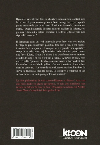 Hyeon-Su vit enfermé dans sa chambre, refusant tout contact avec l'extérieur. Il passe son temps sur le Net et mange les repas déposés par sa mère sur le pas de sa porte. Il hait tout le monde, surtout lui-même... Quand sa famille disparaît dans un accident de voiture, son premier réflexe est la colère : comment a-t-elle pu le laisser seul avec si peu d'économies ? Il déménage dans un vieil immeuble pour faire tenir son maigre héritage le plus longtemps possible. Une fois à sec, c'est décidé, il mettra fin à ses jours... Il compte bien reprendre son quotidien coupé du monde, quand sa jolie voisine tambourine à sa porte comme une furie. Effaré, Hyeon-Su assiste à sa transformation en monstre assoiffé de sang ! Et elle n'est pas la seule... A travers le pays, c'est une véritable épidémie ! Les habitants survivants se barricadent dans l'immeuble, entouré d'effroyables créatures. Certaines rôdent même dans les couloirs... Au coeur de cette situation extrême, l'instinct de survie de Hyeon-Su prend le dessus. Le voilà prêt à tout pour ne pas se faire tuer et, surtout, pour garder son humanité ! La série phénomène du web coréen débarque en France ! Avec son anti-héros lâché en pleine apocalypse, ce huis clos horrifique vous tiendra en haleine de bout en bout. Déjà adapté en drama sur Netflix, Sweet Home n'a pas fini de faire parler de lui !