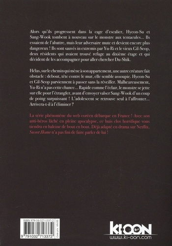 Sans famille, sans amis, sans espoir... un reclus peut-il survivre à l'apocalypse ? Hyeon-Su, aidé de quelques voisins, est parvenu à sauver les enfants d'une mort certaine. Après s'être débarrassés du monstre géant, lui et ses compagnons décident de se réfugier dans l'appartement 1408 où vit Du-Shik Han, l'expert en bricolage, afin de se reposer et de réfléchir à un plan... Pendant ce temps, les habitants qui s'étaient regroupés dans le hall d'entrée ont monté une équipe pour explorer l'immeuble, dans le but de trouver des vivres et d'éventuels survivants. Mais alors que Sang-Wook et Eun-Yu s'apprêtent à barricader le quatrième étage, leurs voix attirent l'attention de la créature aveugle... qui se propulse jusqu'à eux ! Arriveront-ils à la tuer alors qu'ils ne sont que deux ? La série phénomène du web coréen débarque en France ! Avec son anti-héros lâché en pleine apocalypse, ce huis clos horrifique vous tiendra en haleine de bout en bout. Déjà adapté en drama sur Netflix, Sweet Home n'a pas fini de faire parler de lui !