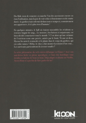 Sans famille, sans amis, sans espoir... un reclus peut-il survivre à l'apocalypse ? Hyeon-Su et ses compagnons ont été secourus par des membres du groupe basé au rez-de-chaussée. Mais, à cause des symptômes qu'il présente déjà, le jeune homme est loin d'être le bienvenu... Eun-Hyeok, qui a pris la tête des survivants, décide alors de l'envoyer au 14e étage chercher Du-Shik, dont les compétences seront bien utiles... La série phénomène du web coréen débarque en France ! Avec son anti-héros lâché en pleine apocalypse, ce huis clos horrifique vous tiendra en haleine de bout en bout. Déjà adapté en drama sur Netflix, Sweet Home n'a pas fini de faire parler de lui !