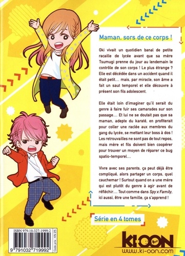 Maman, sors de ce corps ! En bonus limité au 1er tirage : la jaquette alternative réversible revisitée par Ryosuke Tanno ! Oki vivait un quotidien banal de petite racaille de lycée avant que sa mère Tsumugi prenne du jour au lendemain le contrôle de son corps ! Le plus étrange ? Elle est décédée dans un accident quand il était petit... mais, par miracle, son âme a fait un saut temporel et elle découvre à présent son fils adolescent. Elle était loin d'imaginer qu'il serait du genre à faire fuir ses camarades sur son passage... Et lui ne se doutait pas que sa maman, adepte du karaté, en profiterait pour coller une raclée aux membres du gang du lycée, se mettant leur boss à dos ! Les retrouvailles ne sont pas de tout repos, mais mère et fils doivent bien coopérer pour trouver un moyen de réparer ce bug spatio-temporel... Vivre avec ses parents, ça peut déjà être compliqué, alors partager un corps, quel cauchemar ! Surtout quand on a une mère qui est plutôt du genre à agir avant de réfléchir... Tout comme dans Spy x Family , ici aussi, être une famille, ça s'apprend !