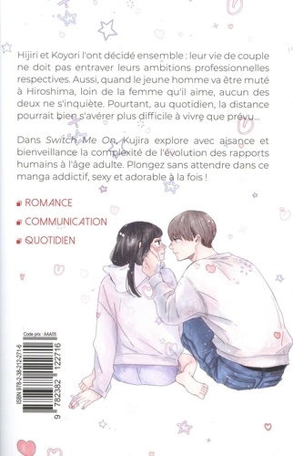 Hijiri et Koyori font décidé ensemble : leur vie de couple ne doit pas entraver leurs ambitions professionnelles respectives. Aussi, quand le jeune homme va être muté à Hiroshima, loin de la femme qu'il aime, aucun des deux ne s'inquiète. Pourtant, au quotidien, la distance pourrait bien s'avérer plus difficile à vivre que prévu ... Dans Switch Me On, Kujira explore avec aisance et bienveillance la complexité de l'évolution des rapports humains à l'âge adulte. Plongez sans attendre dans ce manga addictif, sexy et adorable à la fois !