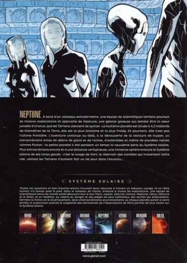 La mission exploratoire se poursuit ! A bord d'un vaisseau extraterrestre, une équipe de scientifiques terriens poursuit sa mission exploratoire et approche des confins du Système solaire, la plus lointaine distance d'avec la Terre. A 4, 5 milliards de kilomètres, apparaît la planète Neptune, une perle de jade faite de gaz gelé qui fait quatre fois la taille de la Terre. Mais le vaisseau et ses passagers vont aller plus loin encore dans le vide sidéral qui reste sous l'influence gravitationnelle du Soleil : direction la Ceinture de Kuiper, un anneau d'astéroïdes dans lequel se trouvent notamment des planètes naines comme Pluton. Et plus loin encore, entourant tout le Système solaire comme une sphère dessinée par des millions de corps célestes, et dans un froid absolu, l'extraordinaire nuage de Oort... à 30 000 milliards de kilomètres ! A bord du vaisseau, d'autres Extraterrestres ont rejoint l'énigmatique Clarke et l'un d'eux, met fin à ses jours. Un événement tragique qui sera contrebalancé par la découverte d'un nouveau vaisseau qui erre dans la ceinture de Kuiper et qui contient peut-être l'avenir de la race extraterrestre qu'on croyait promise à la disparition. La collection Système Solaire, composée de huit tomes offre autant de voyages initiatiques pour découvrir chaque planète, ses spécificités, sa place singulière dans le système solaire et ses étonnants secrets grâce à la force des images et d'un récit en BD. Une collection qui répond à toutes les questions qui nous assaillent dès que nous levons les yeux vers les étoiles, avec la contribution des astronomes de l'Observatoire de Paris !