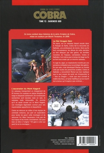 Le Roi Dragon Noir. De repos, sur un vaisseau faisant escale dans le Triangle de Saris, Cobra fait la rencontre de Nathalie, une professeure de tennis. Alors qu'ils font connaissance, les élèves de cette dernière se font attaquer par des gators, de terribles monstres de l'espace, carnassiers. Cobra et Nathalie n'ont mente pas le temps de réagir qu'ils se font tous avaler par un énorme vaisseau. Il s'agit du Jigol, un mastodonte inventé par une ancienne civilisation pour protéger des gators. En son sein, s'est développé Stamax un monde créé par toutes les personnes avalées. Cobra et Nathalie y rencontrent Romul qui leur explique que le seul moyen de sortir est d'emprunter la "Voie du Dragon", route que seul connaît le mettre des lieux, un tyran maléfique qui se mourait de la terreur qu'il inspire à ses victimes ... L'ascension du Mont Kagerô. Un vaisseau transportant un chargement de 20 tonnes d'or explose en pleine tempête de neige et disparait subitement. De nombreuses recherches sont lancées mais en vain, le vaisseau reste introuvable. On raconte qu'ils se serait écrasé sur le Mont Kagerô, une montagne légendaire connue pour ses imprévisibles apparitions et disparitions. Cobra se retrouve au milieu d'une équipe de criminels endurcis, qui par en exploration pour tenter de gravir cette montagne et de retrouver l'or. Mais l'ascension n'est pas de tout repos et les morts s'enchainent. Qui peut bien en être à l'origine ? Et gare à celui qui perd foi en la montagne...