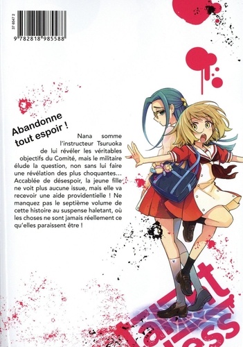 "Etouffe tes pulsions meurtrières ! Renonce à commettre des meurtres ! " Nana a pris la décision d'épargner la vie des Prodiges, mais l'instructeur Tsuruoka lui pose un nouvel ultimatum : liquider un de ses camarades avant une semaine ou être tuée elle-même ! La jeune fille doit par ailleurs redoubler de prudence à cause d'une Prodige nommée Koharu Mishima, qui la harcèle pour qu'elle avoue ses crimes. Ayant renoncé à tuer, Nana tente de donner le change pour se soustraire aux exigences de Tsuruoka... Les Prodiges regagnent la mère patrie, et le sens de la justice est remis en question ! Ne manquez pas le sixième volume de cette histoire au suspense haletant !