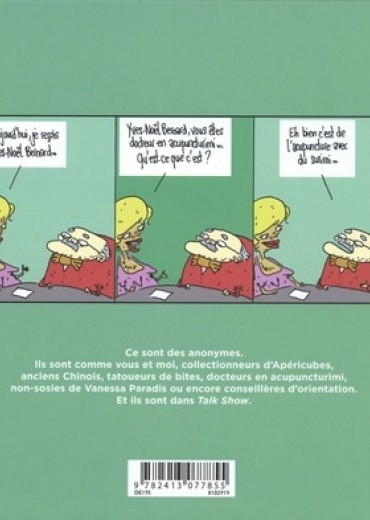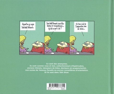 Le principe de Talk Show est simple : on suit une journée entière du même programme où se succèdent une cinquantaine d'invités, tous plus improbables les uns que les autres : un collectionneur d'apéricubes, un non sosie de Vanessa Paradis, un docteur en acupuncturimi (de l'acupuncture avec des bâtonnets de surimi), et autres écrivains du dimanche et défenseurs de causes inutiles.