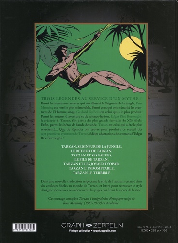 Parmi les nombreux artistes qui ont illustré le Seigneur de la jungle, Russ Manning est resté le plus mémorable. Parmi ceux qui ont scénarisé les aventures de l'Homme-singe, Gaylord DuBois est celui qui a le plus produit. Parmi les auteurs d'aventure et de science-fiction, Edgar Rice Burroughs, le créateur de Tarzan, fait partie des plus grands écrivains du XXe siècle. Enfin, parmi les héros de bande dessinée, Tarzan est celui qui a été le plus représenté... Que de légendes ont oeuvré pour produire ce recueil des sept premières aventures de Tarzan, fidèles adaptations des romans d'Edgar Rice Burroughs ! Dans une nouvelle traduction respectant le style de l'auteur, restauré dans des couleurs fidèles au monde de Tarzan, et lettré pour retrouver le style d'origine, découvrez ou redécouvrez le les pages qui firent le succès de la série.