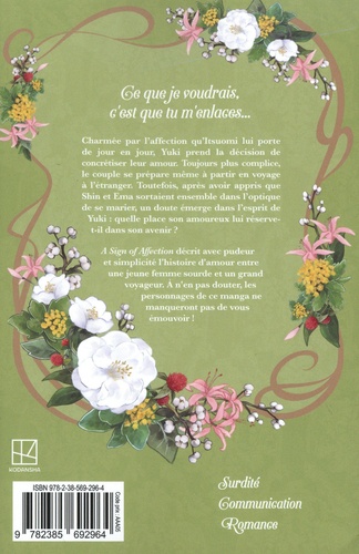 Charmée par l'affection qu'Itsuomi lui porte de jour en jour, Yuki prend la décision de concrétiser leur amour. Toujours plus complice, le couple se prépare même à partir en voyage à l'étranger. Toutefois, après avoir appris que Shin et Ema sortaient ensemble dans l'optique de se marier, un doute émerge dans l'esprit de Yuki : quelle place son amoureux lui réserve-t-il dans son avenir ? A Sign of Affection décrit avec pudeur et simplicité l'histoire d'amour entre une jeune femme sourde et un grand voyageur. A n'en pas douter, les personnages de ce manga ne manqueront pas de vous émouvoir !