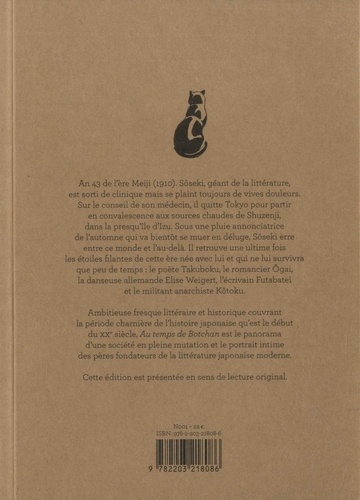 An 43 de l'ère Meiji (1910). Sôseki, géant de la littérature, est sorti de clinique mais se plaint toujours de vives douleurs. Sur le conseil de son médecin, il quitte Tokyo pour partir en convalescence aux sources chaudes de Shuzenji, dans la presqu'île d'Izu. Sous une pluie annonciatrice de l'automne qui va bientôt se muer en déluge, Sôseki erre entre ce monde et l'au-delà. Il retrouve une ultime fois les étoiles filantes de cette ère née avec lui et qui ne lui survivra que peu de temps : le poète Takuboku, le romancier Ogai, la danseuse allemande Elise Weigert, l'écrivain Futabatei et le militant anarchiste Kôtoku. Ambitieuse fresque littéraire et historique couvrant la période charnière de l'histoire japonaise qu'est le début du XXe siècle, Au temps de Botchan est le panorama d'une société en pleine mutation et le portrait intime des pères fondateurs de la littérature japonaise moderne. Cette édition est présentée en sens de lecture original.