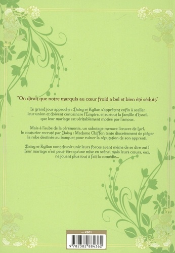 "On dirait que notre marquis au coeur froid a bel et bien été séduit". grand jour approche : Daisy et Kylian s'apprêtent enfin à sceller leur union et doivent convaincre l'Empire, et surtout la famille d'Essel, que leur mariage est véritablement motivé par l'amour. i Mais à l'aube de la cérémonie, un sabotage menace l'oeuvre de Lärl, le couturier recruté par @aisy : Madame Chiffon tente discrètement de piéger la robe destinée au banquet pour ruiner la réputation de son apprenti. Daisy et Kylian vont devoir unir leurs forces avant même de se dire oui ! Leur mariage n'est peut-être qu'une mise en scène, mais leurs coeurs, eux, ne jouent plus tout à fait la comédie...