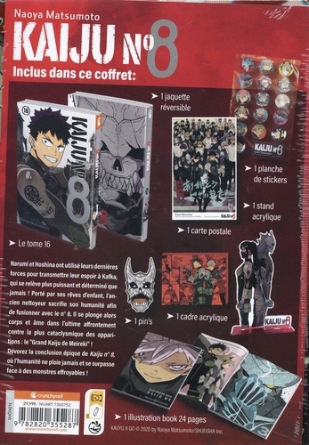 Ce coffret rigide contient : - Le volume 16 de la série - Une jaquette réversible - Un pin's - Un cadre acrylique - Une planche de stickers bombés - Un stand acrylique - Un illustration book de 24 pagesNarumi et Hoshina ont utilisé leurs dernières forces pour transmettre leur espoir à Kafka, qui se relève plus puissant et déterminé que jamais ! Porté par ses rêves d'enfant, l'ancien nettoyeur sacrifie son humanité afin de fusionner avec le n° 8. Il se plonge alors corps et âme dans l'ultime affrontement contre la plus cataclysmique des apparitions : le "Grand Kaiju de Meireki" ! Dévorez la conclusion épique de Kaiju n° 8, où l'humanité ne ploie jamais et se surpasse face à des monstres effroyables !