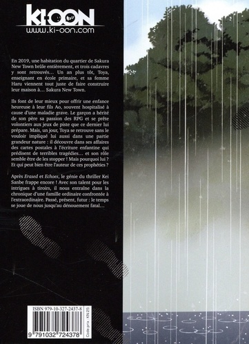 Les prophéties pourront-elles stopper l'inéluctable tragédie ? En 2019, une habitation du quartier de Sakura New Town brûle entièrement, et trois cadavres y sont retrouvés... Un an plus tôt, Toya, enseignant en école primaire, et sa femme Haru viennent tout juste de faire construire leur maison à... Sakura New Town. Ils font de leur mieux pour offrir une enfance heureuse à leur fils Ao, souvent hospitalisé à cause d'une maladie grave. Le garçon a hérité de son père sa passion des RPG et se prête volontiers aux jeux de piste que ce dernier lui prépare. Mais, un jour, Toya se retrouve sans le vouloir impliqué lui aussi dans une partie grandeur nature : il découvre dans ses affaires des cartes postales à l'écriture enfantine qui prédisent de terribles tragédies... et son rôle semble être de les stopper ! Mais pourquoi lui ? Et qui peut bien être l'auteur de ces prophéties ? Après Erased et Echoes, le génie du thriller Kei Sanbe frappe encore ! Avec son talent pour les intrigues à tiroirs, il nous entraîne dans la chronique d'une famille ordinaire confrontée à l'extraordinaire. Passé, présent, futur : le temps se joue de nous jusqu'au dénouement fatal...