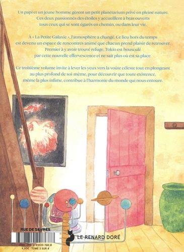 Un papi et un jeune homme gèrent un petit planétarium privé en pleine nature. Ces deux passionnés des étoiles y accueillent à bras ouverts tous ceux qui se sont égarés en chemin, ou dans leur vie. A "La Petite Galaxi", l'atmosphère a changé. Ce lieu hors du temps est devenu un espace de rencontres animé que chacun prend plaisir de retrouver. Premier à y avoir trouvé refuge, Tokio est bousculé par cette nouvelle effervescence et ne sait plus où est sa place. Ce troisième volume invite à lever les yeux vers la voûte céleste tout en plongeant au plus profond de soi-même, pour découvrir que toute existence, même la plus infime, contribue à l'harmonie du monde qui nous entoure.