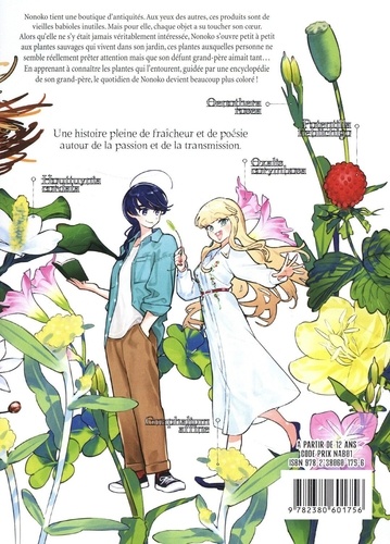 Nonoko tient une boutique d'antiquités. Aux yeux des autres, ces produits sont de vieilles babioles inutiles. Mais pour elle, chaque objet a su toucher son coeur. Alors qu'elle ne s'y était jamais véritablement intéressée, Nonoko s'ouvre petit à petit aux plantes sauvages qui vivent dans son jardin, ces plantes auxquelles personne ne semble réellement prêter attention mais que son défunt grand-père aimait tant... En apprenant à connaître les plantes qui l'entourent, guidée par une encyclopédie de son grand-père, le quotidien de Nonoko devient beaucoup plus coloré ! Une histoire pleine de fraîcheur et de poésie autour de la passion et de la transmission.