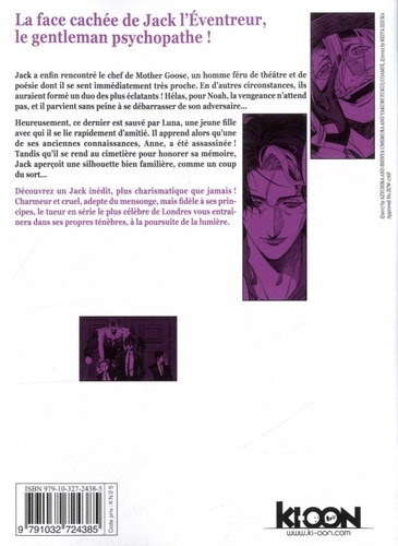 La face cachée de Jack l'Eventreur, le gentleman psychopathe ! Jack a enfin rencontré le chef de Mother Goose, un homme féru de théâtre et de poésie dont il se sent immédiatement très proche. En d'autres circonstances, ils auraient formé un duo des plus éclatants ! Hélas, pour Noah, la vengeance n'attend pas, et il parvient sans peine à se débarrasser de son adversaire... Heureusement, ce dernier est sauvé par Luna, une jeune fille avec qui il se lie rapidement d'amitié. Il apprend alors qu'une de ses anciennes connaissances, Anne, a été assassinée ! Tandis qu'il se rend au cimetière pour honorer sa mémoire, Jack aperçoit une silhouette bien familière, comme un coup du sort... Découvrez un Jack inédit, plus charismatique que jamais ! Charmeur et cruel, adepte du mensonge, mais fidèle à ses principes, le tueur en série le plus célèbre de Londres vous entraînera dans ses propres ténèbres, à la poursuite de la lumière.