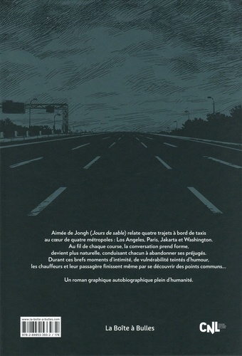 Aimée de Jongh (Jours de sable) relate quatre trajets à bord de taxis au coeur de quatre métropoles : Los Angeles, Paris, Jakarta et Washington. Au fil de chaque course, la conversation prend forme, devient plus naturelle, conduisant chacun à abandonner ses préjugés. Durant ces brefs moments d'intimité, de vulnérabilité teintés d'humour, les chauffeurs et leur passagère finissent même parse découvrir des points communs... Un roman graphique autobiographique plein d'humanité.