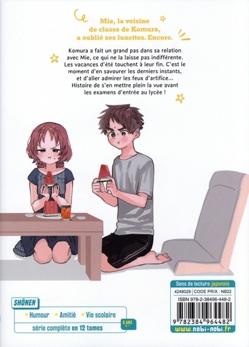 "Mie, la voisine de classe de Komura, a oublié ses lunettes. Encore." Komura a fait un grand pas dans sa relation avec Mie, ce qui ne la laisse pas indifférente. Les vacances d'été touchent à leur fin. C'est le moment d'en savourer les derniers instants, et d'aller admirer les feux d'artifice... Histoire de s'en mettre plein la vue avant les examens d'entrée au lycée !