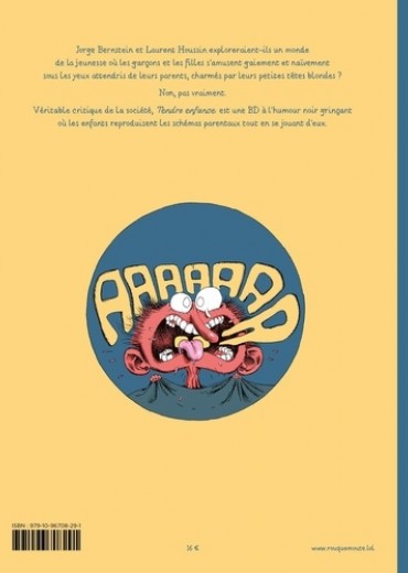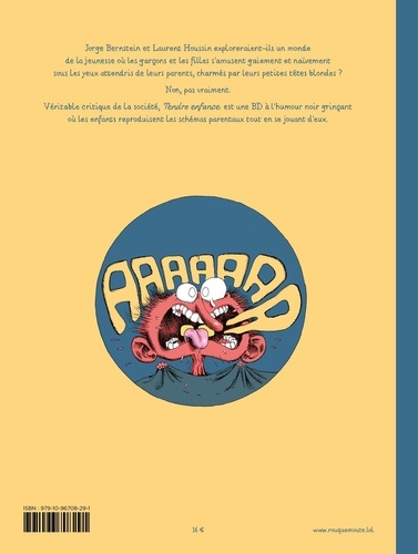 Jorge Bernstein et Laurent Houssin exploreraient-ils un monde de la jeunesse où les garçons et les filles s'amusent gaiement et naïvement sous les yeux attendris de leur parents, charmés par leurs petites têtes blondes ? Non, pas vraiment. Véritable critique de la société, Tendre enfance est une BD à l'humour noir grinçant où les enfants reproduisent les schémas parentaux tout en se jouant d'eux.