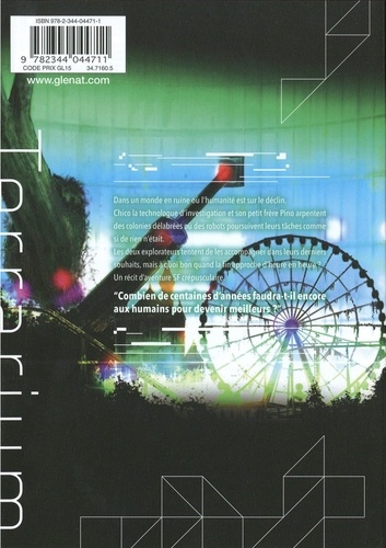 Balade poétique dans un monde en ruine où la nature a repris ses droits Dans un monde en ruine où l'humanité est sur le déclin, Chico la technologue d'investigation et son petit frère Pino arpentent des colonies délabrées où des robots poursuivent leurs tâches inlassablement. Les deux explorateurs tentent de les accompagner dans leurs derniers souhaits, mais à quoi bon quand la fin approche d'heure en heure ? "Combien de centaines d'années faudra-t-il encore aux humains pour devenir meilleurs ? " C'est la question soulevée par ce récit d'aventure SF crépusculaire. L'auteur et l'éditeur de ce beau manga n'étaient pas des plus connus au Japon. Mais la beauté de l'ouvrage a suffi pour que les libraires japonais le mettent en avant dans leurs boutiques et provoquent un vrai coup de coeur chez les libraires français, en voyage au Japon pour fêter les 50 ans de Glénat ! Le voici enfin en France, pour illuminer vos bibliothèques...