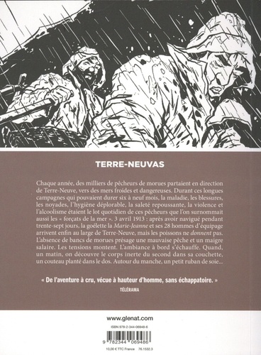 Chaque année des milliers de pêcheurs de morues partaient en direction de Terre-Neuve, vers des mers froides et dangereuses. Durant ces longues campagnes qui pouvaient durer six à neuf mois, la maladie, les blessures, les noyades, l'hygiène déplorable, la saleté repoussante, la violence et l'alcoolisme étaient le lot quotidien de ces pêcheurs que l'on surnommait aussi les forçats de la mer. Le 3 avril 1913, après avoir navigué pendant trente-sept jours, la goélette la Marie-Jeanne et ses 28 hommes d'équipage arrivent enfin au large de Terre-Neuve mais les poissons ne donnent pas. L'absence de bancs de morues présage une mauvaise pêche et un maigre salaire Les tensions montent. L'ambiance à bord s'échauffe quand un matin, on découvre le corps inerte du second dans sa couchette, un couteau planté dans le dos. Autour du manche, un petit ruban de soie. Chabouté nous immerge avec brio dans les conditions de vie extrêmes de ces marins du début du XXe siècle et signe un thriller captivant et inquiétant.