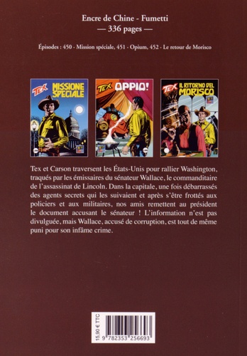Tex et Carson traversent les Etats-Unis pour rallier Washington, traqués par les émissaires du sénateur Wallace, le commanditaire de l'assassinat de Lincoln. Dans la capitale, une fois débarrassés des agents secrets qui les suivaient et après s'être frottés aux policiers et aux militaires, nos amis remettent au président le document accusant le sénateur ! L'information n'est pas divulguée, mais Wallace, accusé de corruption, est tout de même puni pour son infâme crime.