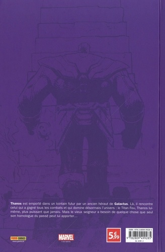 Thanos voyage dans le futur où il découvre un monde dans lequel il a remporté la victoire sur les héros de la Terre, sur Galactus, sur l'univers ! Mais le Thanos âgé et victorieux qu'il rencontre est à la fois sa plus grande gloire et sa plus grande honte. Quelle en est la raison ? Que vient faire le Silver Surfer dans cette histoire ? Et qui est le Ghost Rider cosmique ? Donny Cates a rapidement pris une place importante dans la maison des Idées, notamment grâce à cette saga. Pour un coup d'essai, elle fut un coup de maître, la première pièce posée dans ce qu'on appelle désormais le "Cates-verse", et sans doute l'aventure de Thanos la plus mémorable depuis le Gant de l'Infini !