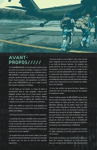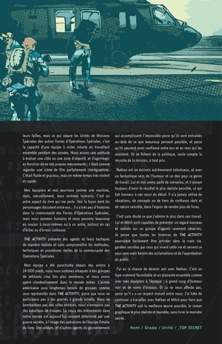Après avoir intégré l'Intelligence Secret Support Activity, le sergent Leslie Ryon a fait le choix de sortir à jamais des manuels d'Histoire. Jamais ses faits d'armes ne seront connus du grand public ou même de ses anciens supérieurs. Evoluant désormais sous le nom de code de Fiddler, pseudonyme hérité de sa première mission, elle partage avec cette élite des services de renseignement la tension et les échecs qui lient chacun de ses membres. Mais derrière un professionnalisme sans faille, elle découvre également des hommes et des femmes. THE ACTIVITY est l'occasion pour Nathan Edmondson (Who is Jake Ellis ?, Black Widow) et Mitch Gerads (Punisher) de faire pénétrer le lecteur dans les coulisses du renseignement et de lui faire partager le quotidien de ces hommes et femmes de l'ombre» qui ont fait le choix de dédier leur vie aux services secrets. Documentés et éclairés par de nombreux témoignages, les auteurs rendent compte de manière réaliste de la diversité et de la complexité de la géostratégie contemporaine. Mexique, Allemagne, Afghanistan, Colombie. Autant de théâtres d'opérations que devra couvrir cette équipe d'agents spéciaux, au péril de leur vie.