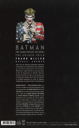 Alors qu'une élection polémique approche et provoque un soulèvement sans précédent ou in de la population de Gotham, Batwoman, Superwoman et son jeune fière, le fils de Superman et wonder women, tentent de lever le voile sur la panique qui s'empare des citoyens de la ville. Car, derrière le candidat populiste se cache le seigneur d'Apokolips, le maitre de l'Anti-Vie, Darkseid ! DARK KNIGHT — THE GOLDEN CHILD, ou le récit complet qui fait directement suite aux événements de DARK KNIGHT III. Frank MILLER fait un retour fracassant dans le futur qu'il a bâti avec DARK KNIGHT RETURNS et DARK KNIGHT STRIKES AGAIN et suit désormais les aventures de Carrie Kelley, devenue Batwoman, le dernier espoir de Gotham. Il est ici associé au trait fantastique de Rafael GRAMPA, mélange détonnant entre Katsuhiro OTOMO et Frank QUITELY. Les deux auteurs tendent ainsi un reflet déformant de notre époque avec, en toile de fond, les tensions politiques qui animent de nos jours les foules réelles comme virtuelles.