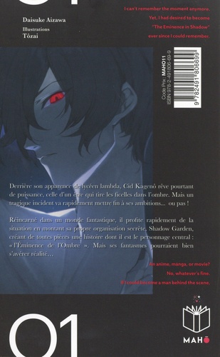Derrière son apparence de lycéen lambda, Cid Kagenô rêve pourtant de puissance, celle d'un être qui tire les ficelles depuis l'ombre. Mais un tragique incident va rapidement mettre fin à ses ambitions... ou pas ! Réincarné dans un monde fantastique, il profite rapidement de la situation en montant sa propre organisation secrète, Shadow Garden, créant de toute pièces une histoire dont il est le personnage principal : "l'Eminence de l'Ombre" . Mais ses fantasmes pourraient bien s'avérer réalité...