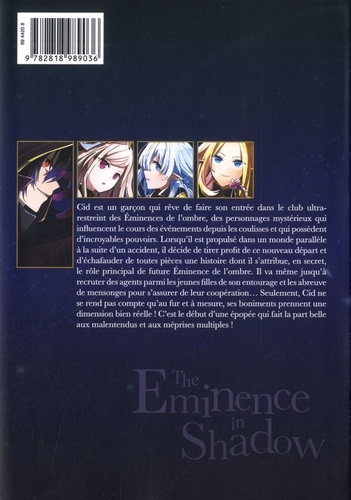 Il est prêt à tout pour devenir une Eminence de l'ombre... mais ses plus gros mensonges vont le rattraper ! Un des meilleurs mangas isekai du moment : action, complots et humour décalé ! Cid est un garçon qui rêve de faire son entrée dans le club ultra-restreint des Eminences de l'ombre, des personnages mystérieux qui influencent le cours des événements depuis les coulisses et qui possèdent d'incroyables pouvoirs. Lorsqu'il est propulsé dans un monde parallèle à la suite d'un accident, il décide de tirer profit de ce nouveau départ et d'échafauder de toutes pièces une histoire dont il s'attribue, en secret, le rôle principal de future Eminence de l'ombre. Il va même jusqu'à recruter des agents parmi les jeunes filles de son entourage et les abreuve de mensonges pour s'assurer de leur coopération... Seulement, Cid ne se rend pas compte qu'au fur et à mesure, ses boniments prennent une dimension bien réelle ! C'est le début d'une épopée qui fait la part belle aux malentendus et aux méprises multiples !