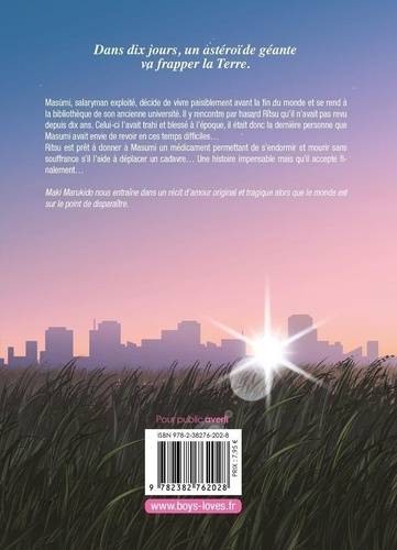 Masumi, salaryman exploité, décide de vivre paisiblement avant la fin du monde et se rend à la bibliothèque de son ancienne université. Il y rencontre par hasard Ritsu qu'il n'avait pas revu depuis dix ans. Celui-ci l'avait trahi et blessé à l'époque, il était donc la dernière personne que Masumi avait envie de revoir en ces temps difficiles... Ritsu est prêt à donner à Masumi un médicament permettant de s'endormir et mourir sans souffrance s'il l'aide à déplacer un cadavre... Une histoire impensable mais qu'il accepte finalement... Maki Marukido nous entraîne dans un récit d'amour original et tragique alors que le monde est sur le point de disparaître.