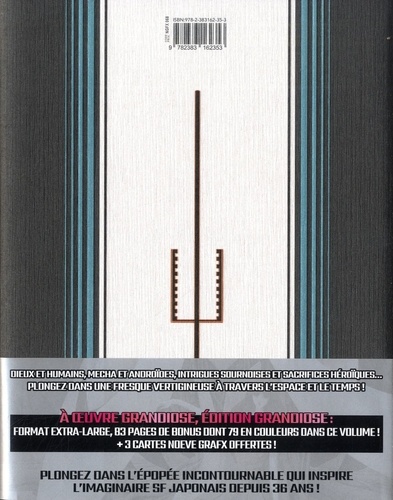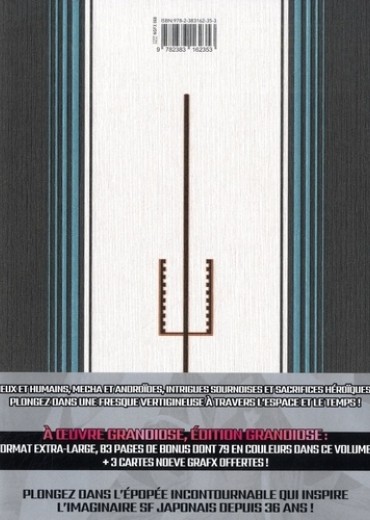 Dieux et humains, mecha et androïdes, intrigues sournoises et sacrifices héroïques... Plongez dans une fresques vertigineuse à travers l'espace et le temps. Plongez dans l'épopée incontournable qui inspire l'imaginaire SF japonais depuis 36 ans !