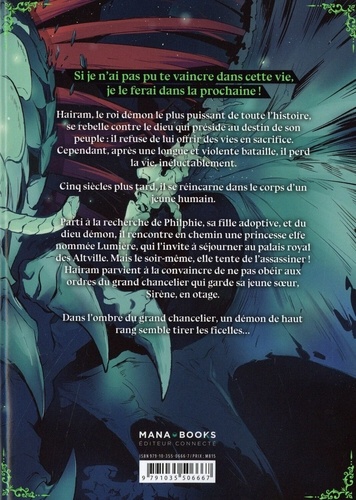 Si je n'ai pas pu te vaincre dans cette vie, je le ferai dans la prochaine ! Hairam, le roi démon le plus puissant de toute l'histoire, se rebelle contre le dieu qui préside au destin de son peuple : il refuse de lui offrir des vies en sacrifice. Cependant, après une longue et violente bataille, il perd la vie, inéluctablement. Cinq siècles plus tard, il se réincarne dans le corps d'un jeune humain. Parti à la recherche de Philphie, sa fille adoptive, et du dieu démon, il rencontre en chemin une princesse elfe nommée Lumière, qui l'invite à séjourner au palais royal des Altville. Mais le soir-même, elle tente de l'assassiner ! Hairam parvient à la convaincre de ne pas obéir aux ordres du grand chancelier qui garde sa jeune soeur, Sirène, en otage. Dans l'ombre du grand chancelier, un démon de haut rang semble tirer les ficelles...