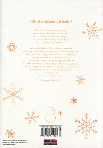"Elle est si mignonne... Je fonds ! " D'un côté, nous avons Himuro, descendant des temps modernes de la célèbre femme des neiges. De l'autre, Fuyutsuki, sa collègue aussi gentille qu'unique... Mais aussi frais qu'ils puissent paraître, aucun des deux n'est doué en relations amoureuses. Profitant d'un voyage dans une ville thermale, Saejima déclare sa flamme à Komori. S'il est heureux pour ses collègues, Himuro a l'impression de faire du surplace avec Fuyutsuki. Du café à thème au barbecue, il ne recule devant rien pour se retrouver en sa compagnie et faire évoluer sa relation avec elle. Courage, Himuro ! The Ice Guy & The Cool Girl est un manga publié originellement sur le compte Twitter de Miyuki Tonogaya. Grâce à son dessin magnifique et à ses personnages charismatiques, la mangaka nous offre une romance aussi chaleureuse que mignonne.