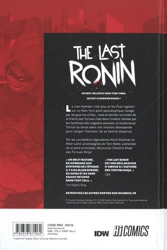 Qui est le dernier Ronin ? Le clan Hamato n'est plus et les Foot règnent sur un New York post-apocalyptique ravagé par les guerres civiles... mais le dernier survivant de la fratrie des Tortues rôde dans l'ombre. Hantée par les fantômes des tragédies passées, la mystérieuse Tortue se lance dans une mission désespérée pour venger l'honneur de sa famille disparue. Par les cocréateurs légendaires Kevin Eastman et Peter Laird, accompagnés de Tom Waltz, scénariste de la série principale, découvrez l'histoire finale des Tortues Ninja ! Un best-seller du New York Times "Un récit mature, en hommage aux dystopies de l'époque. Il y a du Blade Runner, du Akira et du Dark Knight Returns dans tout cela". The Mighty Blog "The Last Ronin est une déclaration d'amour à l'histoire des Tortues Ninja". CBR