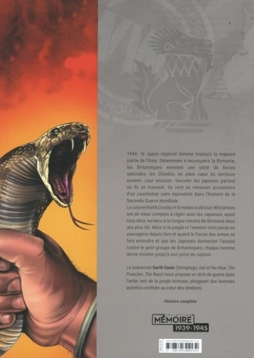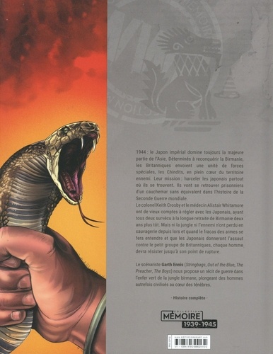 1944 : le Japon impérial écrase toujours la majeure partie de l'Asie sous sa botte. Déterminés à reconquérir leur emprise sur la Birmanie, les Britanniques envoient une unité de forces spéciales, les Chindits, loin derrière les lignes japonaises, avec pour mission d'attaquer l'ennemi partout où ils le pourront. Ils vivront un vértaible cauchemar, comme seule la Seconde Guerre mondiale peut en offrir. Le colonel Keith Crosby et le docteur Alistair Whitamore, deux vétérans de la longue retraite à travers la Birmanie deux ans auparavant, ont de vieux comptes à régler avec les Japonais. Mais ni la jungle ni l'ennemi ne sont devenus moins sauvages, et lorsque la fusillade éclate et que les Japonais s'abattent sur la petite force britannique, chaque homme sera mis à rude épreuve. Le scénariste Garth Ennis (The Boys, Preacher, Out of the Blue) et le dessinateur PJ Holden (Stringbags) présentent un récit de guerre infernale dans la jungle, où des êtres humains apparemment civilisés sombrent dans un coeur apocalyptique de ténèbres.