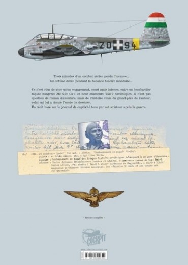 Trois minutes d'un combat aérien perdu d'avance... Un infime détail pendant la seconde guerre mondiale... Ce n'est rien de plus qu'un engagement, court mais intensif, entre un bombardier rapide hongrois Me 210 Ca-1 et neuf chasseurs Yak-9 soviétiques. Il n'est pas question de roman d'aventure, mais de l'histoire vraie du grand-père de l'auteur, celui qui lui a donné l'envie de dessiner. Un récit basé sur le journal de captivité tenu par cet aviateur après la guerre. C'est aussi l'histoire d'un avion déjà oublié, produit à seulement quelques exemplaires.