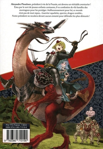 Alexandre Ploutinov, Président à vie de la Prussie, pensait avoir tout dompté... jusqu'à ce qu'il débarque dans un monde fantastique peuplé de centaures et de dragons ! Alexandre Ploutinov, président à vie de la Prussie est devenu un véritable aventurier ! Emu par le sort de jeunes enfants centaures, il va combattre de vils bandits des montagnes pour les protéger. Malheureusement pour lui, ce monde n'est pas de tout repos... Guerrier squelette, spectre, dragon zombie... Notre président ne reculera devant aucun ennemi pour défendre les plus démunis !