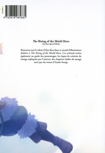 Retrouvez tout le talent d'Aiya Kyu dans ce recueil d'illustrations dédiées à The Rising of the Shield Hero. Cet artbook inclut également un guide des personnages, les étapes de création du manga expliquées par l'auteure, des chapitres inédits du manga ainsi que du roman d'Aneko Yusagi.