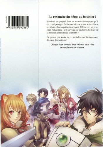 La revanche du héros au bouclier ! Naofumi est projeté dans un monde fantastique qu'il est censé protéger. Mais contrairement aux autres héros invoqués, il ne reçoit qu'une arme défensive : un bouclier. Parviendra-t-il à survivre sur ces terres hostiles où la trahison est monnaie courante ? Chaque écrin contient deux volumes de la série et une illustration couleur.