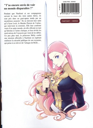 "T'as encore envie de voir un monde disparaître ? " Pendant que Naofumi et ses compagnons suivent la trace des trois autres héros, ils sont pris dans un guet-apens tendu par un mystérieux assassin ! Ils ne doivent leur salut qu'à Syne Lock, la Murder Pierrot de l'arène, qui intervient in extremis. Elle leur confirme venir d'un autre monde, où elle officiait en tant qu'héroïne à l'arme clanique, et leur révèle les motivations de l'assassin qui vient de les défier. Un peu plus tard, la princesse Melty confie une mission officielle à Naofumi en espérant renforcer la sécurité publique de son royaume, qui peine à se relever de l'attaque de Reiki...