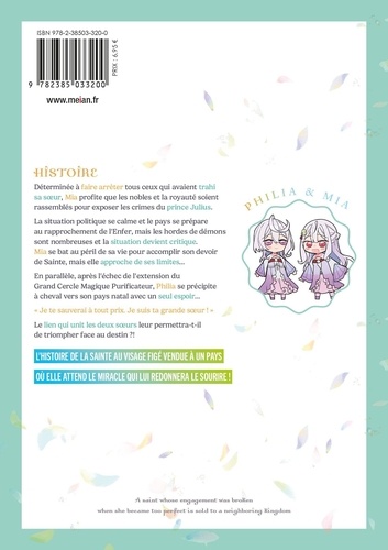 Déterminée à faire arrêter tous ceux qui avaient trahi sa soeur, Mia profite que les nobles et la royauté soient rassemblés pour exposer les crimes du prince Julius. La situation politique se calme et le pays se prépare au rapprochement de l'Enfer, mais les hordes de démons sont nombreuses et la situation devient critique. Mia se bat au péril de sa vie pour accomplir son devoir de Sainte, mais elle approche de ses limites... En parallèle, après l'échec de l'extension du Grand Cercle Magique Purificateur, Philia se précipite à cheval vers son pays natal avec un seul espoir... " Je te sauverai à tout prix. Je suis ta grande soeur ! " Le lien qui unit les deux soeurs leur permettra-t-il de triompher face au destin ? ! L'histoire de la Sainte au visage figé vendue à un pays où elle attend le miracle qui lui redonnera le sourire !