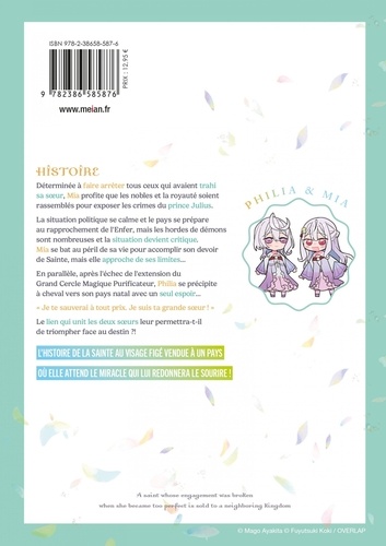 Déterminée à faire arrêter tous ceux qui avaient trahi sa soeur, Mia profite que les nobles et la royauté soient rassemblés pour exposer les crimes du prince Julius. La situation politique se calme et le pays se prépare au rapprochement de l'Enfer, mais les hordes de démons sont nombreuses et la situation devient critique. Mia se bat au péril de sa vie pour accomplir son devoir de Sainte, mais elle approche de ses limites... En parallèle, après l'échec de l'extension du Grand Cercle Magique Purificateur, Philia se précipite à cheval vers son pays natal avec un seul espoir... " Je te sauverai à tout prix. Je suis ta grande soeur ! " Le lien qui unit les deux soeurs leur permettra-t-il de triompher face au destin ? ! L'histoire de la Sainte au visage figé vendue à un pays où elle attend le miracle qui lui redonnera le sourire !