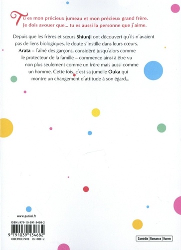 Tu es mon précieux jumeau et mon précieux grand frère. Je dois avouer que... tu es aussi la personne que j'aime. Depuis que les frères et soeurs Shiunji ont découvert qu'ils n'avaient pas de liens biologiques, le doute s'instille dans leurs coeurs. Arata - l'aîné des garçons, considéré jusqu'alors comme le protecteur de la famille - commence ainsi à être vu non plus seulement comme un frère mais aussi comme un homme. Cette fois c'est sa jumelle Ouka qui montre un changement d'attitude à son égard...