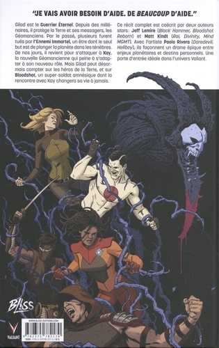 Gilad est le Guerrier Eternel. Depuis des millénaires, il protège la Terre et ses messagers, les Géomanciens. Par le passé, plusieurs furent tués par l'Ennemi Immortel, un être dont le seul but est de plonger la planète dans les ténèbres. De nos jours, il revient pour s'attaquer à Roy, la nouvelle Géomancienne qui peine à s'adapter à son nouveau rôle. Mais Gilad peut désormais compter sur les héros de la Terre, et sur Bloodshot, un super-soldat amnésique dont la rencontre avec Kay changera sa vie à jamais. Ce récit complet est coécrit par deux auteurs stars : Jeff Lemire (Black Hammer, Bloodshot Reborn) et Matt Kindt (Rai, Divinity, Mind MGMT). Avec l'artiste Paolo Rivera (Daredevil, Hellboy), ils façonnent un drame épique entre enjeux planétaires et destins personnels. Une porte d'entrée idéale dans l'univers Valiant.