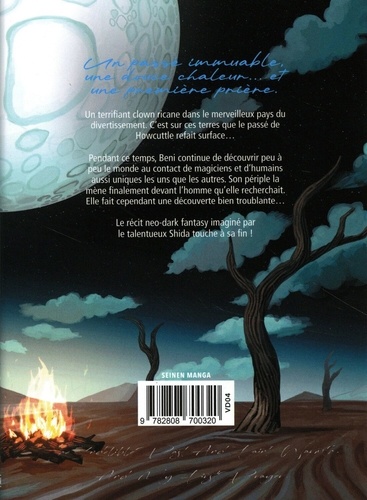 Un terrifiant clown ricane dans le merveilleux pays du divertissement. C'est sur ces terres que le passé de Howcuttle refait surface... Pendant ce temps, Beni continue de découvrir peu à peu le monde au contact de magiciens et d'humains aussi uniques les uns que les autres. Son périple la mène finalement devant l'homme qu'elle recherchait. Elle fait cependant une découverte bien troublante... Le récit neo-dark fantasy imaginé par le talentueux Shida touche à sa fin