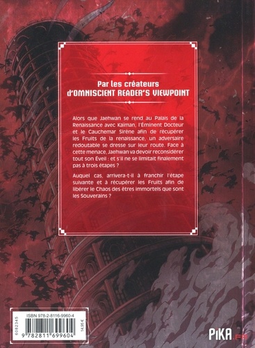 Alors que Jaehwan se rend au Palais de la Renaissance avec Kaïman, l'Eminent Docteur et le Cauchemar Sirène afin de récupérer les Fruits de la renaissance, un adversaire redoutable se dresse sur leur route. Face a cette menace, Jaehwan va devoir reconsidérer tout son Eveil : et s'il ne se limitait finalement pas a trois étapes ? Auquel cas, arrivera-t-il a franchir l'étape suivante et à récupérer les Fruits afin de libérer le Chaos des êtres immortels que sont les Souverains ?