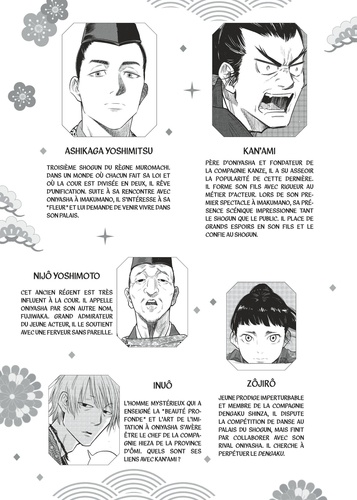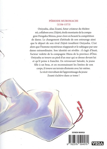 Oniyasha, alias Zeami, futur créateur du théâtre nô, collabore avec Zôjirô, étoile montante de la compagnie Dengaku Shinza, pour clore en beauté la compétition de danse. Le changement d'attitude de son entourage ainsi que le départ de son rival Zôjirô troublent Oniyasha. C'est alors que l'homme mystérieux réapparaît et le subjugue par une danse extraordinaire. Son identité est révélée : il s'agit d'Inuô, l'acteur vedette de la compagnie Hieza de la province d'Oral. Oniyasha se trouve au pied d'un mur qui se dresse devant lui et qu'il peine à franchir. En retrouvant Satsuki, la jeune fille à un bras, et en reconnaissant les limites de son corps, il trouve un terrain d'entente avec lui-même. Le récit virevoltant de l'apprentissage du jeune Zeami s'achève dans ce tome !